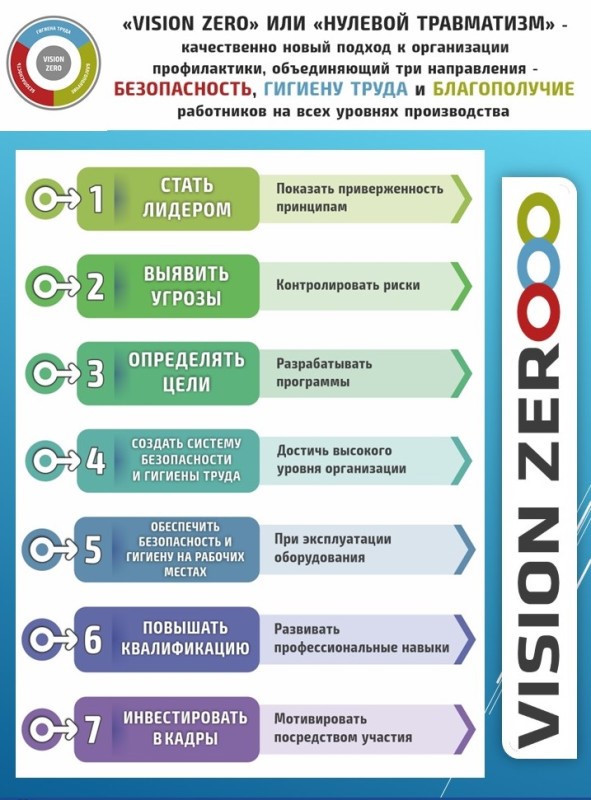 «Vision Zero» (Нулевой травматизм) – это качественно новый подход к организации профилактики, объеди-няющий три направления – производственная безопасность, охрана труда и благополучие работников на всех уровнях производства.