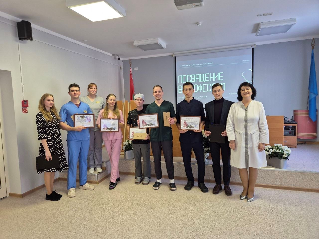 С целью чествования молодых специалистов на первом рабочем месте 17.10.2024 года в актовом зале поликлиники прошло торжественное мероприятие «Посвящение в профессию». Молодыми специалистами была подготовлена презентация, в которой они рассказали о том, что привело их в эту профессию, о своих пусть небольших достижениях и победах, и конечно же о планах на будущее.