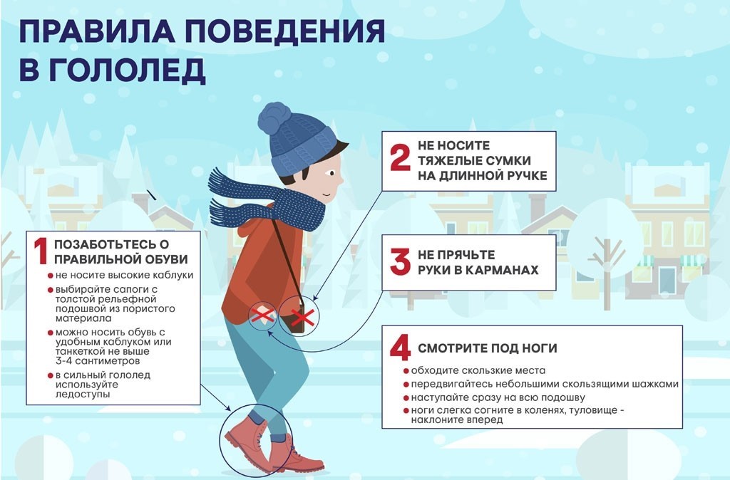 - При гололеде необходимо передвигаться крайне осторожно, не нужно торопиться.